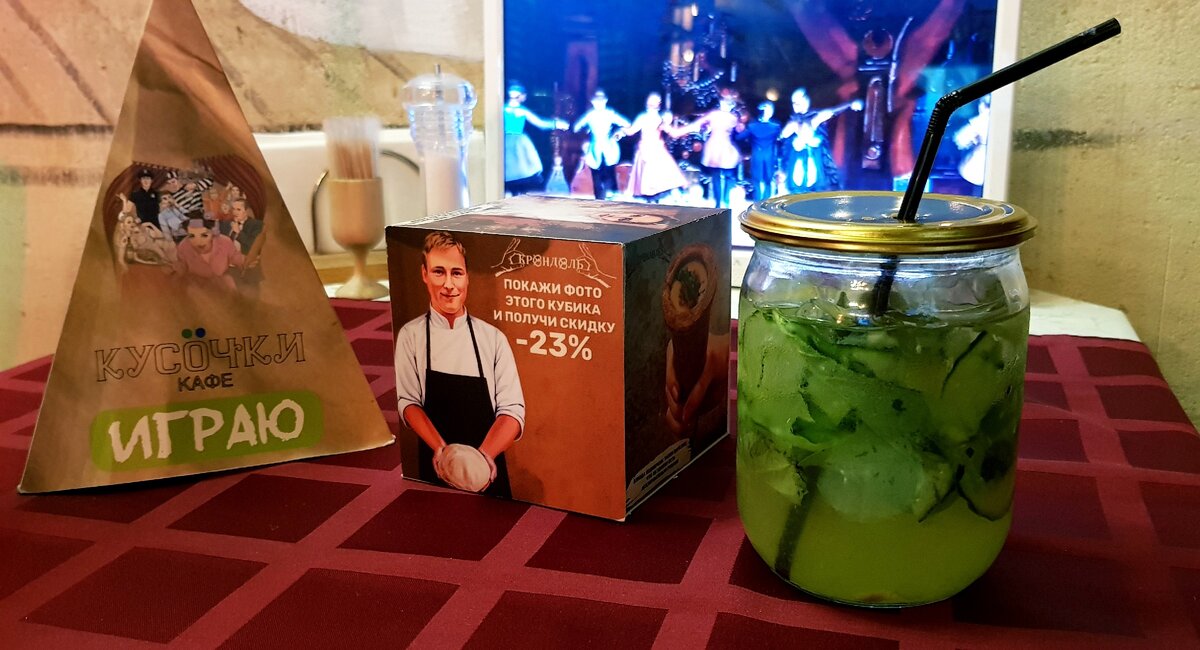To be continued - хотелось мне написать в конце статьи про кафе " Кусочки". А ведь продолжение действительно следует. Как одно звено цепочки прикрепляется к другому, так и эти два кафе связаны между собой. Вначале надо зайти в " Кусочки ",и там, кроме хорошего обеда - можно поучаствовать в весёлом спектакле или просто посмотреть на него и хорошо провести время. А главное, что надо обязательно сделать, это сфотографировать стоящий на столе кубик. И уже в следующий раз, прийти в кафе " Крендель ", показать эту фотографию официанту и получить скидку 23% на всё меню! Что я и сделала.