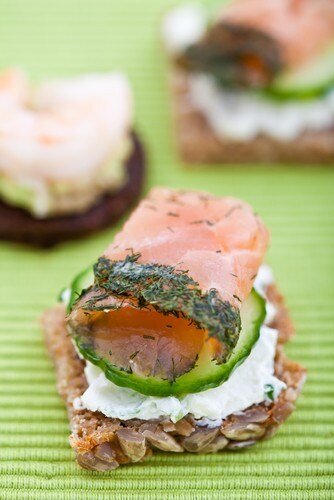 3. На каждый положите по кружку огурца, немного соуса и по ломтику рыбы. Сверху украсьте веточками укропа.