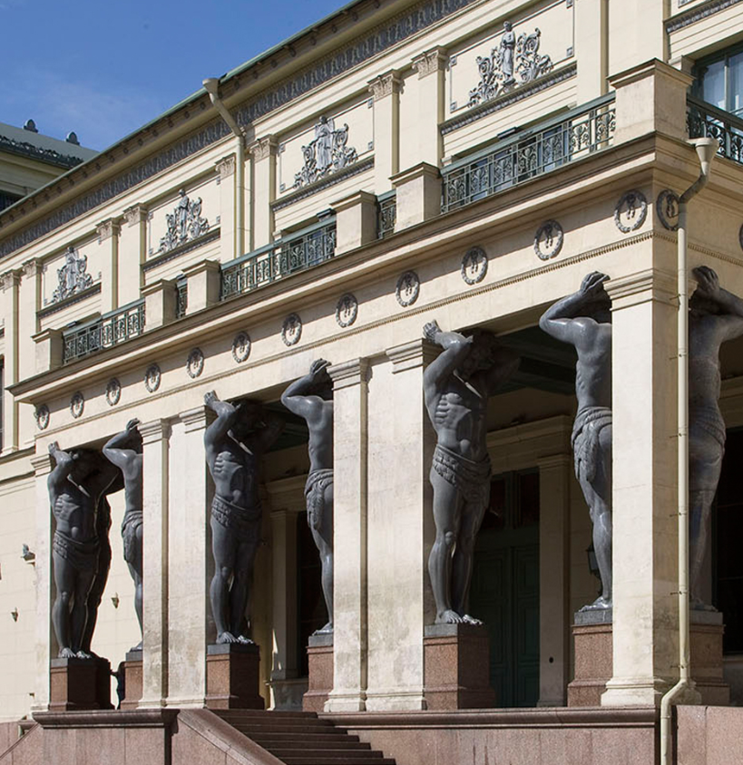 Атланты, которые упоминаются в песне, поддерживают портик здания Нового Эрмитажа, возведённого под руководством Стасова и Ефимова в 1842-1851 годах по проекту Лео фон Кленце, разработанному специально для размещения художественных коллекций музея. Десять пятиметровых фигур могучих атлантов, повторяющих аналогичные фигуры древнегреческого храма Зевса Олимпийского, вытесали в 1846 году из серого сердобольского гранита 150 каменотёсов в мастерской скульптора Александра Ивановича Теребенёва.