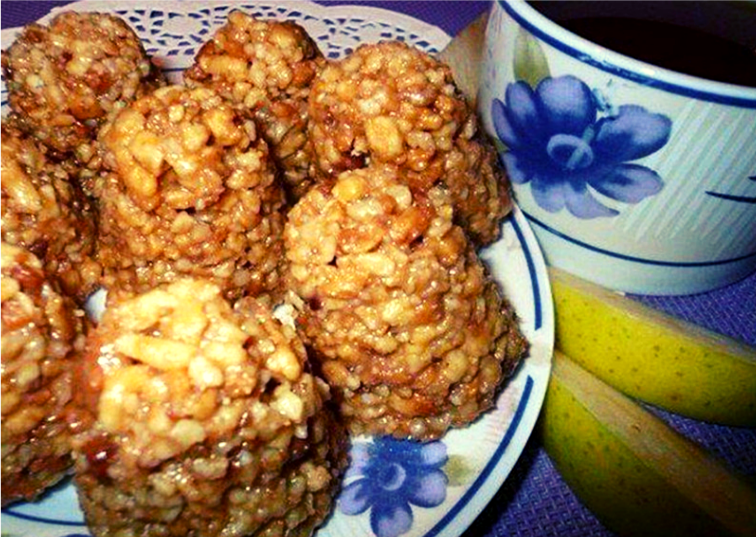 5. Достать, дать остыть и измельчить руками или вилкой в крошку, затем залить сгущёнкой.
