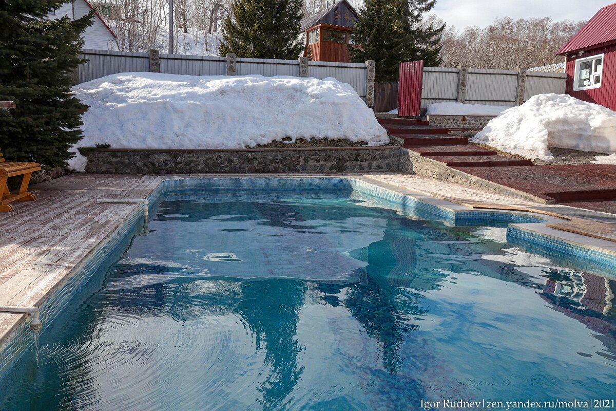 Термальная вода непрерывно поступает в бассейн, компенсируя таким образом потерю температуры из-за контакта с окружающей средой. Напомню, что хоть на дворе и начало апреля, на Камчатке даже днем температура держится в районе нуля, а ночью так вообще опускается в минус.
