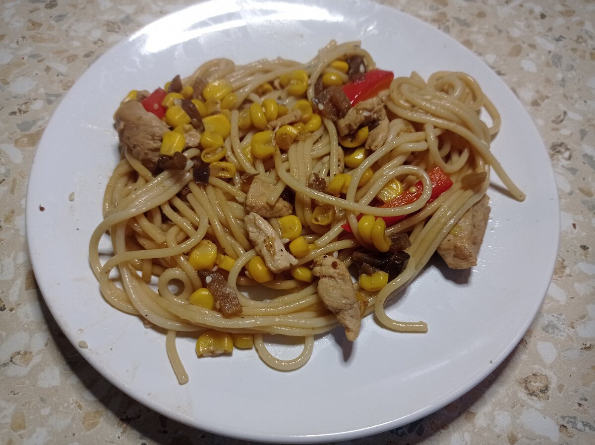 Пока овощи тушатся с курицей, варю спагетти до состояния , которое принято называть аль дэ́нтэ.