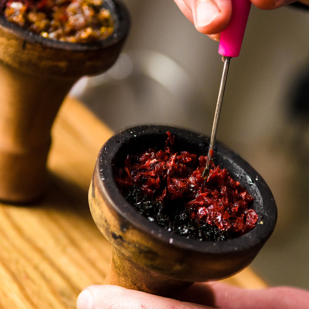 - Глиняная чаша . Забивка чаши кальяна из глины должна быть пушистой. Необходимо взять табак, разрыхлить его и свободно уложить. Затем накрыть калаудом или фольгой. Если курите на фольге, необходимо взять 2-4 слоя, все зависит от ее плотности. Делаем много маленьких отверстий. Курим, как правило, на трех углях. Глиняные чаши очень популярны и подходят практически для любого табака