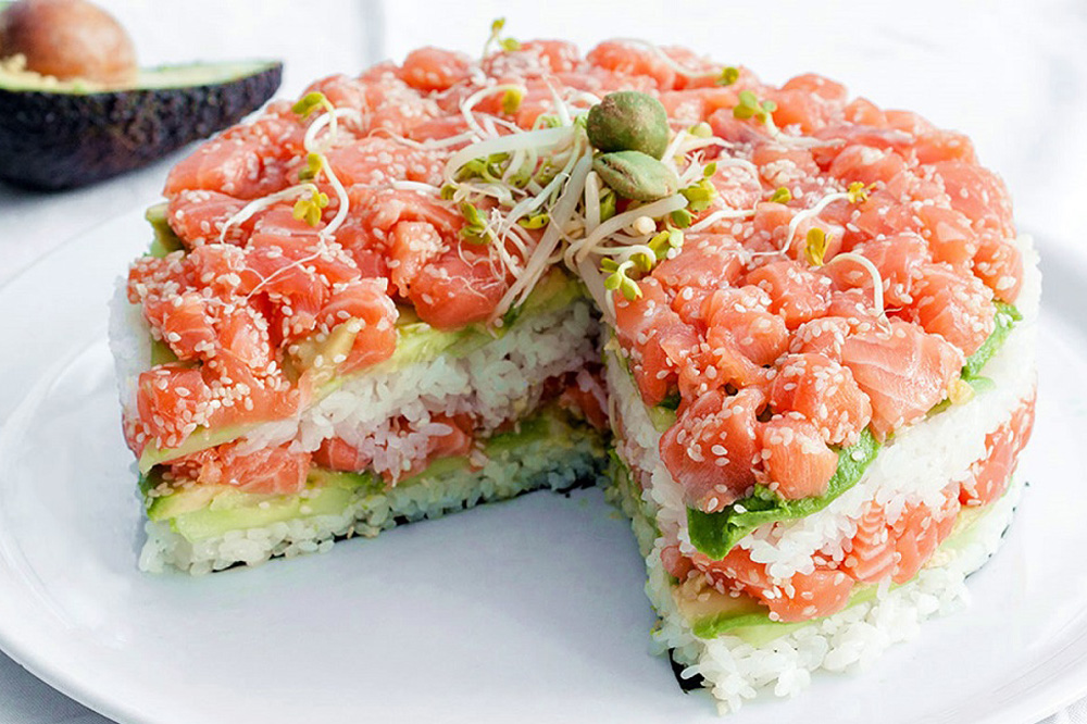 Чтобы не готовить большое количество роллов и суши можно приготовить альтернативный вид этих японских блюд. Приготовить суши-торт, который готовится быстрее, чем скручивание большого количества роллов.
