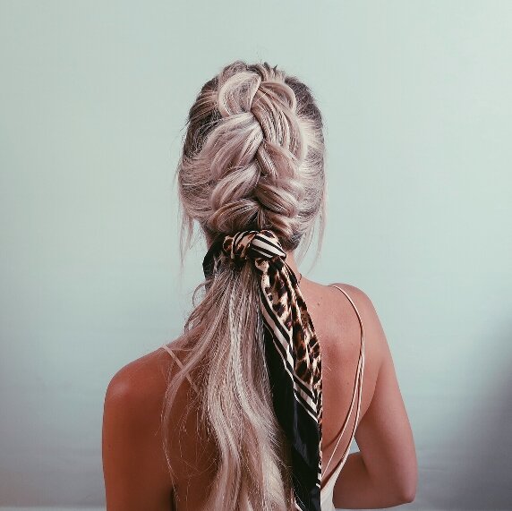 Можно завязать кончики косы платком, чтобы придать волосам непринужденный и расслабленный вид. В летний день он не только сделает прическу более элегантной, но и подарит дополнительный комфорт.