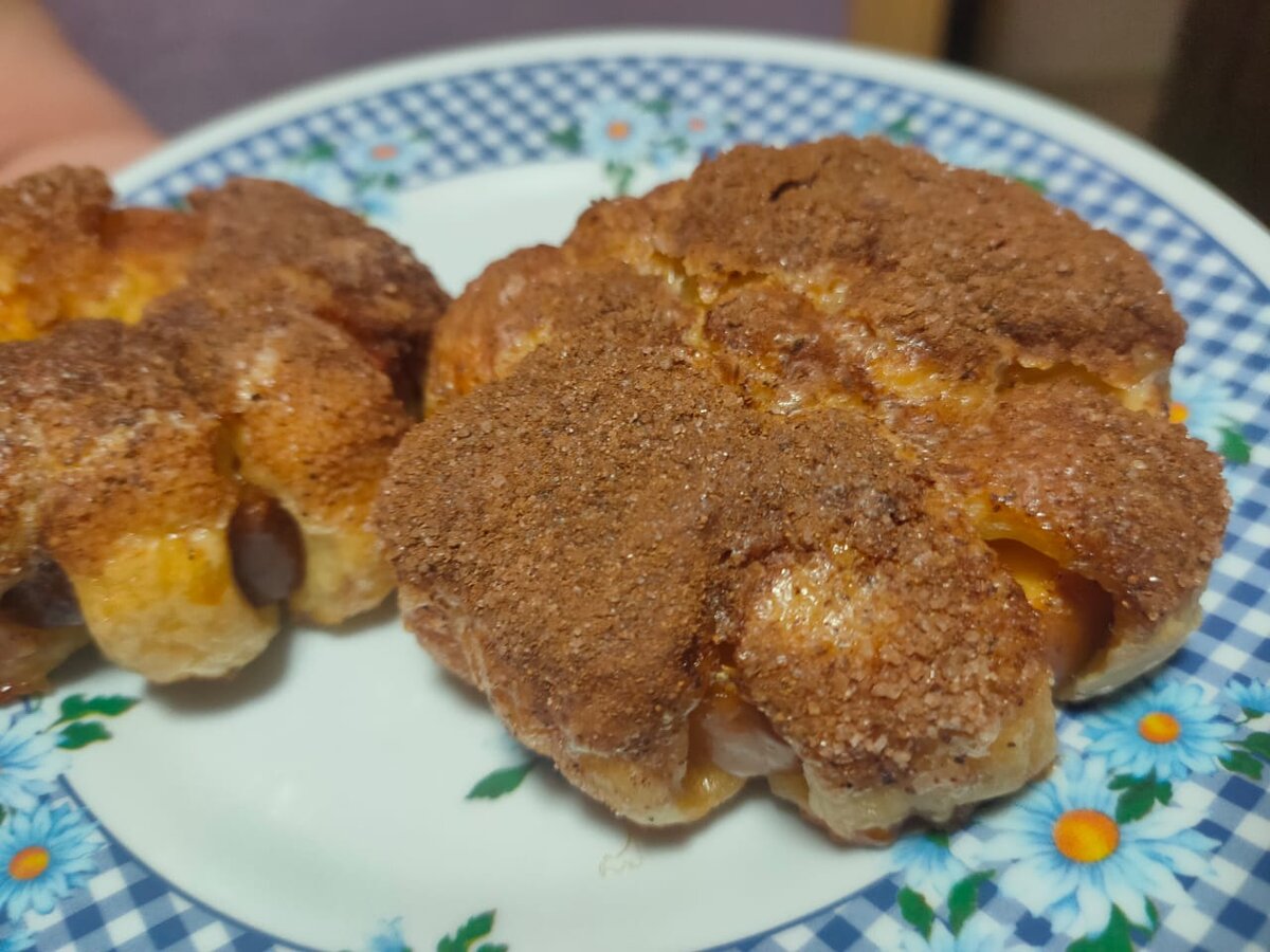 Обмакиваем в яичную смесь и сразу в сахарно- коричную посыпку. Выкладываем на противень, застеленный пергаментной бумагой. Так готовим все колечки и ставим противень в духовку.