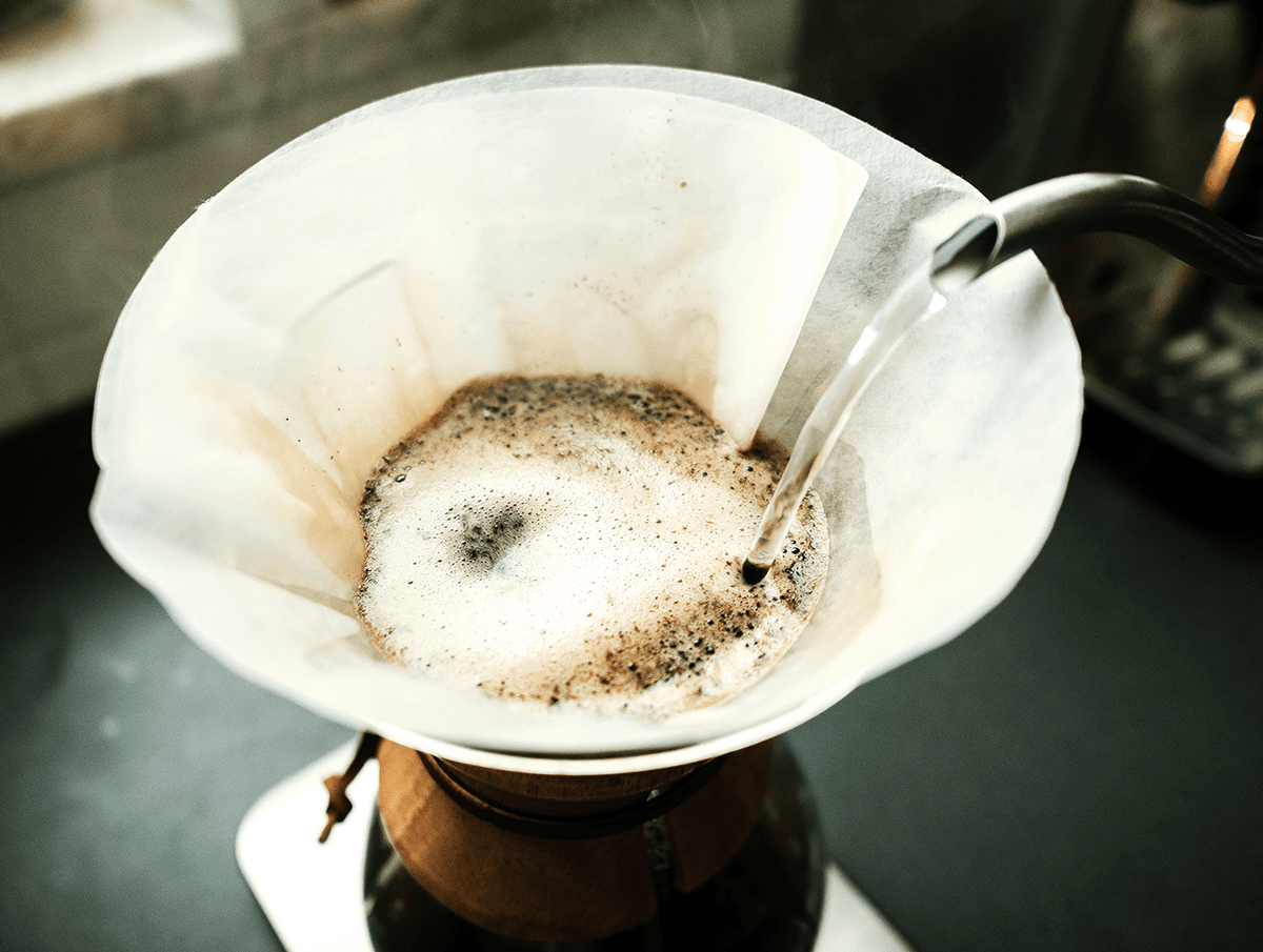 - Чтобы на поверхности кофе появилась пенка, начните наливать кипяток из центра, постепенно двигаясь к краям молотых зёрен.