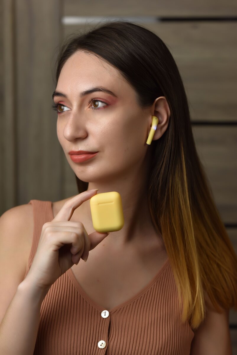 Но до этого я покупала лишь белые i12, а в этот раз решила, что летом будет круто ходить с ярким гаджетом. Собственно, цветов у продавца на выбор 6: белый, чёрный и 4 цветных варианта. Мне понравился политивный жёлтый. Отмечу, что в выбранном цвете не