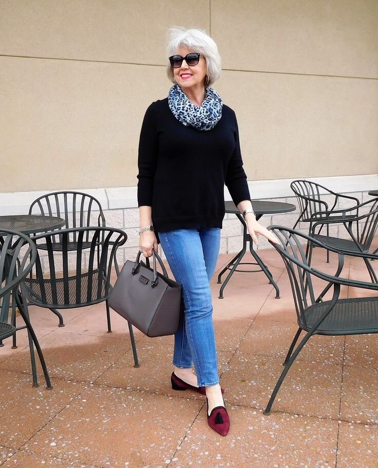 - Не забываем про джинсы, эта одежда не имеет возраста. Конечно, модели с огромными прорехами покупать не стоит, лучше отдать предпочтение классике без декора. Для весны можно приобрести светло-голубые джинсы. Они отлично сочетаются с рубашкой свободного силуэта с рисунком, напоминающим расцветку шкуры зебры. К образу выбраны черные босоножки и красная сумка.