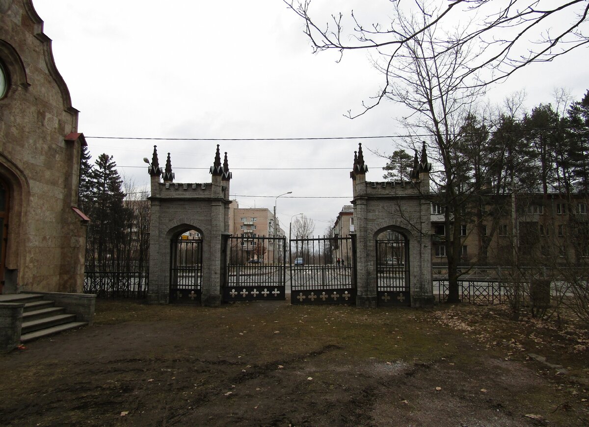 А вот со стороны Санкт-Петербургского проспекта, по которому идут автобусы и маршрутки, как раз таки есть. Чрезвычайно эффектные ворота. Радом – домик привратника. Смотрится оригинально, однако назвать его уникальным вряд ли можно – абсолютно такой же есть, например, в Ораниенбаумском парке.