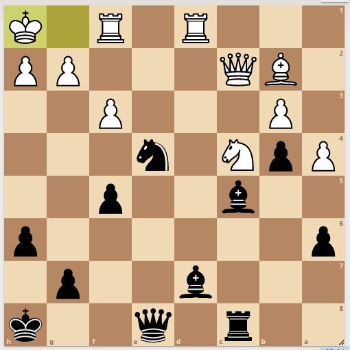 Хочу показать окончание моей партии в интернете. Я играл черными. Рейтинг моего соперника был 2219. Партия как то не задалась, соперник выиграл у меня "качество" (ладью за слона). Я дал шах слоном на с5, соперник отошел королем на h1. Черные начинают и выигрывают.