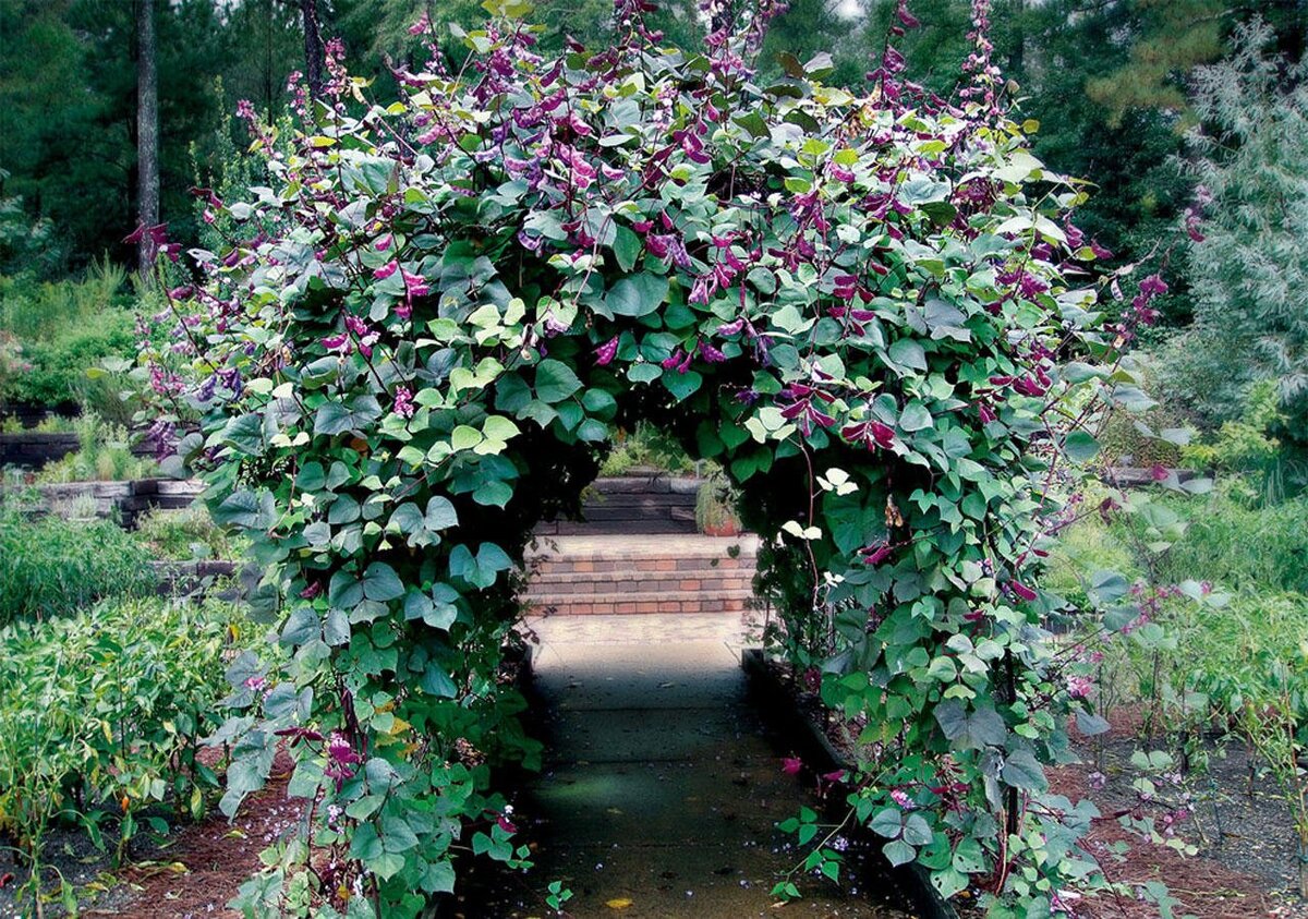 Долихос с насыщенными зелёными листьями или красно-фиолетовыми листьями придаёт незабываемый эффект. Отлично