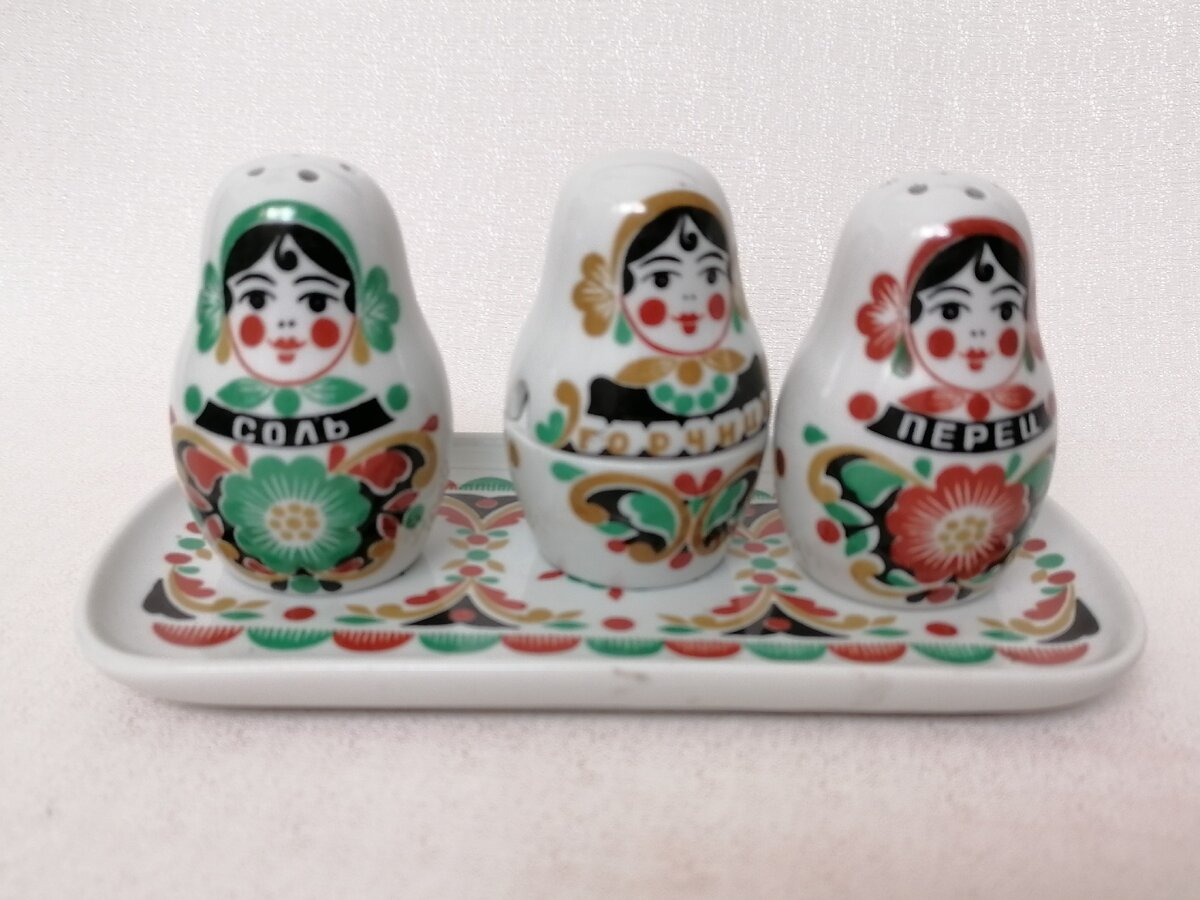 У меня есть солонки- матрешки. Покупала я их давно, на барахолке, комплект был не полный, но мне очень хотелось, поэтому купила то, что было. И тут мне приятельница рассказывает, что у нее есть лишний набор. Как она сказала, что покупала дочерям, но им не надо. Она долго ждала, вдруг