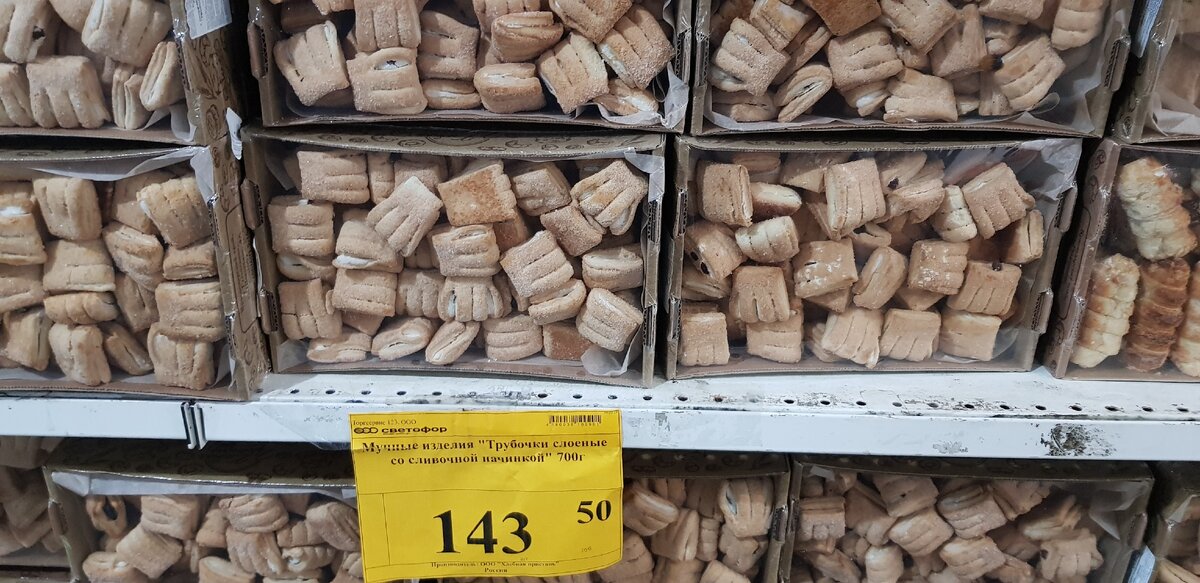 Мучные изделия " Трубочки слоёные со сливочным начинкой" , в упаковке семьсот грамм, стоимость сто сорок три рубля...