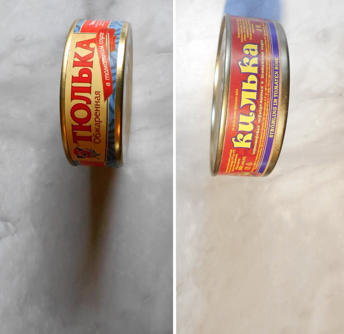 И та, и другая продукция неразделана, одинаковой массой 240 г, перед производством была в заморозке. К кильке добавлено «обжарена», что уже лучше. Зато килька сделана по ТУ, а тюлька выдержала ГОСТ.