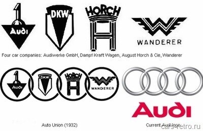 Четыре кольца на эмблеме "Ауди" неспроста . Они означают слияние четырех компаний — "Ауди Верке", "Аугуст Хорьх Аутомобил Верке", "ДКВ" и "Вандерер" в 1934 году. Поначалу логотип Ауди использовался только на гоночных машинах, простые же автомобили каждая компания производила под своим брендом и украшала собственными эмблемами. На иллюстрации представлены логотипы каждой из объеденившихся компаний. В 1964 году Volkswagen купил Audi, но логотип остался прежним.