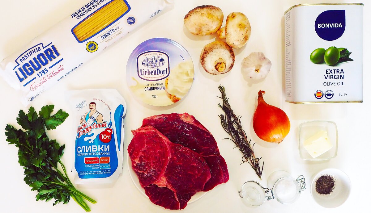 Всем огромный привет, друзья! Сегодня речь пойдет про мясо и макароны. Этот рецепт я использую часто, но даже не думала, что мои гости будут благодарить меня весь вечер и просить добавки)! Блюдо получилось сытным, готовилось быстро и просто, а что еще нужно для идеального ужина? Ингредиенты: ПРИГОТОВЛЕНИЕ: ШАГ 1. Достав стейки из холодильника, просушите их от лишней влаги бумажным полотенцем. Мясо с обеих сторон посолите и поперчите, смажьте оливковым маслом и приправьте веточками розмарина. Затем оставьте стейки минут на 20 минут, чтобы их температура сравнялась с комнатой, а соль и перец успели немного впитаться. А тем временем подготовим продукты для гарнира. ШАГ 2. Репчатый лук нарезаем тонкими перьями, половинки будет вполне достаточно, грибы шампиньоны нарезаем небольшим кубиком, чеснок нарезаем слайсами. ШАГ 3. В кипящую подсоленную воду отправляем пасту из твердых сортов пшеницы и варим до состояния альденте, те на 2- 3 минуты меньше, чем указано на упаковке. Пока готовится