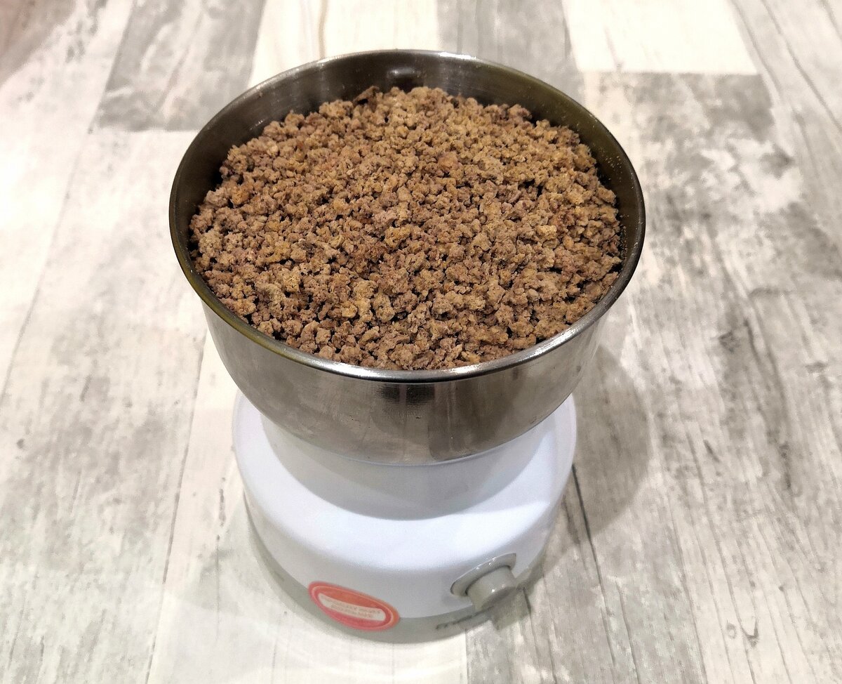 Перемалываем фарш в кофемолке до состояния мясного порошка, тоже самое делаем с ягодами и перемешиваем.