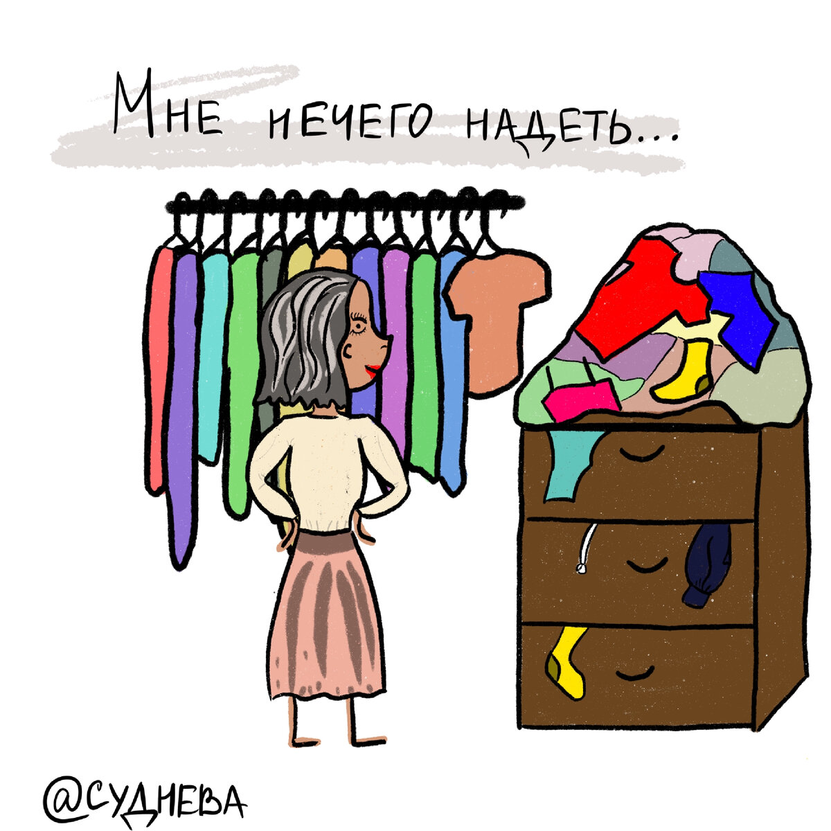 Знакома такая картина? Стоишь перед открытыми ящиками комода или створками шкафа. Одежда сваливается с полок, вешалки висят так плотно, что не двигаются, а надеть нечего: это колет, это мало, это раздражает самим фактом существования, а в этом чувствуешь себя ужасно. И просто останавливаешь выбор на затасканных штанах и любимой блузке. Поднимите руку, если это вы.
