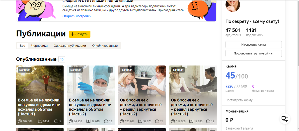 Опубликовала первый рассказ и так получилось, что уехала на несколько дней в гости к сестре, а рассказы остались дома в тетради. По возвращению домой сделала публикацию, вторую. И на третий день увидела, что шкала времени стремительно движется к заветным 10 000 минут. И вот 5 апреля появилась кнопочка «настроить монетизацию». Я, конечно, поторопилась отправить документы в поддержку и принялась с нетерпением ждать ответа. А к терпеливым я точно не отношусь.