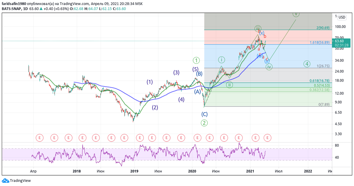 На двухчасовом графике при более подробном разглядывание вырисовывается та же картина. RSI в зоне перекупленности просит продолжение снижения в волне c of (y) of [IV].