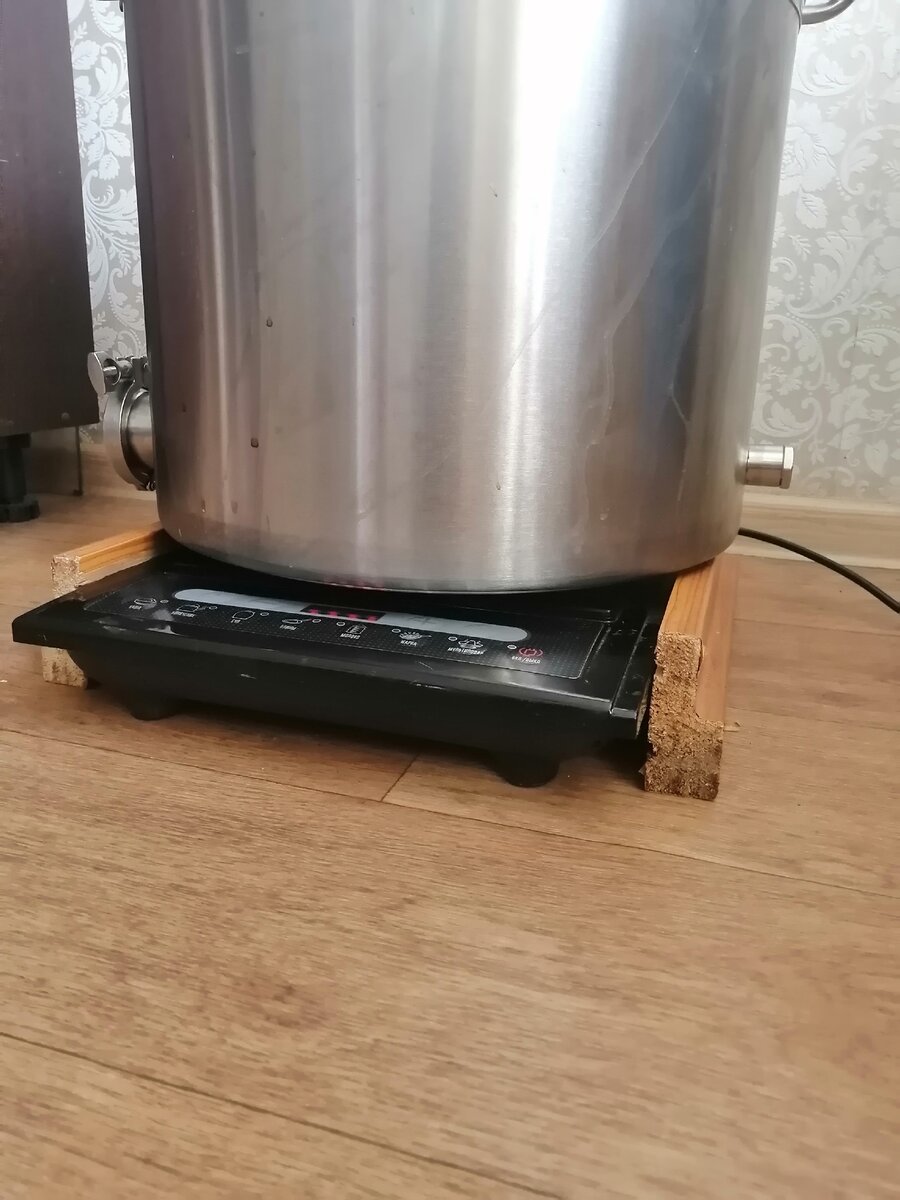 Секрет оказывается совсем прост. Нужно всего лишь уменьшить нагрузку перегонного куба на плитку, или вовсе её исключить. А это значит поднять его над плитой. Если бак одинакового или меньшего диаметра, чем поверхность плиты, придётся немного постараться, придумывая изобретение, поднимающее перегонный куб над индукционной поверхностью. Но если ( а чаще всего так и есть ) бачок больше плиты, необходимо по краям просто придумать подставки, которые будут слегка возвышаться над поверхностью , на которые и установится наша перегонная ёмкость.