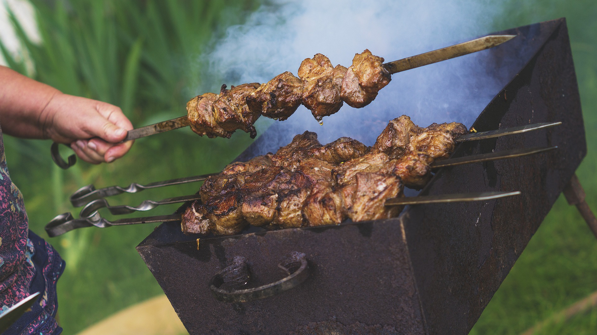 Далее подготавливаем мангал разжигаем угли, посыпаем их солью, чтобы снизить возможность возгорания жира. Надеваем мясо на шампуры и приступаем к процессу жарки.
