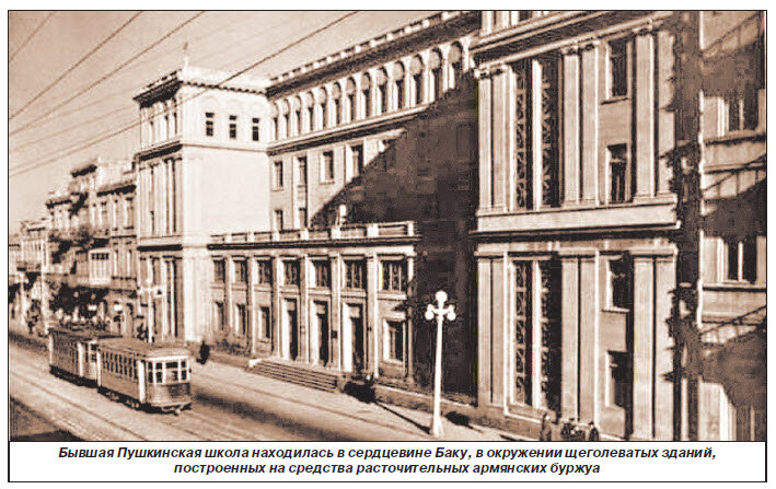 Пушкинская школа считалась одной из самых элитных в Баку и находилась на красивейшей улице города – Телефонной (28 Апреля), которой в начале XX века прочили славу питерского Невского проспекта. Здание школы было построено в советские годы в живописном пространстве «симфонии из камня», в окружении щеголеватых жилых домов, построенных в стиле модерн и необарокко на средства расточительных армянских буржуа – Адамовых, Маиловых, Тараевых, Саркисова, Восканова, Авакова, Арафелова, Арзуманяна, Егиазарова...