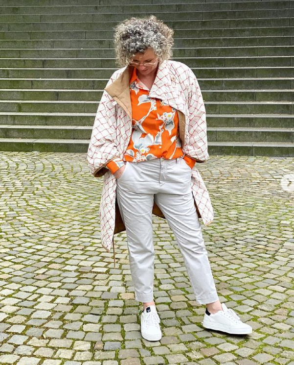 Стильный образ с белыми брюками и оранжевой рубашкой с крупным цветочным принтом. Рубашка аккуратно заправлена за пояс брюк, что подчёркивает линию талии. Образ дополняет двухсторонний плащ, одна сторона у него однотонная, бежевого цвета. Вторая – белая с тонким, изящным принтом. Обувь выбрана комфортная – белые кроссовки.
