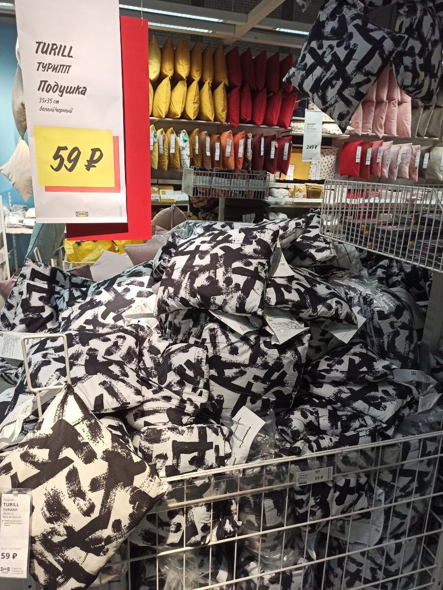 Есть в двух вариантах: квадратная 40 на 40 см и прямоугольная 30 на 58. Стоит 149-229 рублей. Проблема та же, что и с ТУРИЛЛ: неприятный полиэстр снаружи и внутри. Такая подушка, возможно, окажется вечной и даже после стирки не потеряет форму. Но что толку, если к ней не хочется лишний раз прикасаться? И снова некрасивый блеск, напоминающий не о домашнем текстиле, а о колготках конца 90-х.