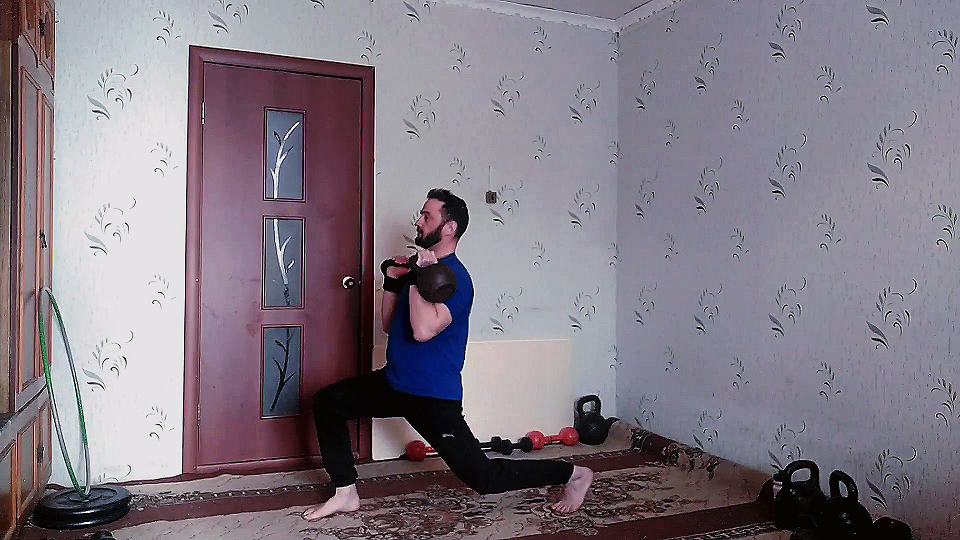 *Примечание: если испытываете боли в коленях при выпадах и глубоких приседаниях, то от гирь можно воздержаться и ограничиться гантелями. Либо вообще исключить.