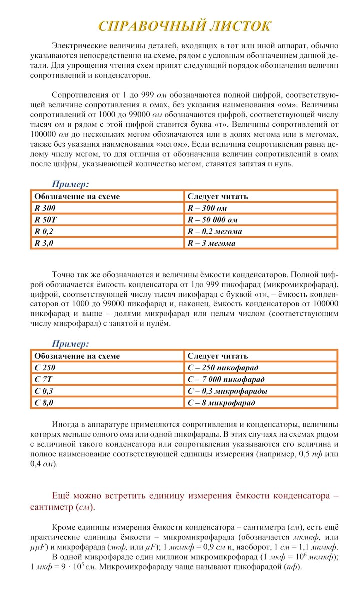 В изданиях до 1953 года, при чтении принципиальных схем устройств, видно, что обозначение номиналов таких радиодеталей, как резистор (R) и конденсатор (C), указано в величинах отличных от тех, что используются сегодня.
