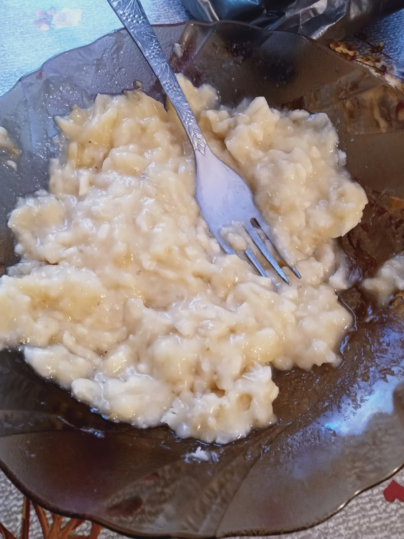 2.Дальше вам нужно взять бананы и очистить их.Теперь ломаем банан на кусочки и кладём их в тарелку.Достаём вилку и начинаем размягчать эти кусочки.(для размягчения можно использовать блендер)