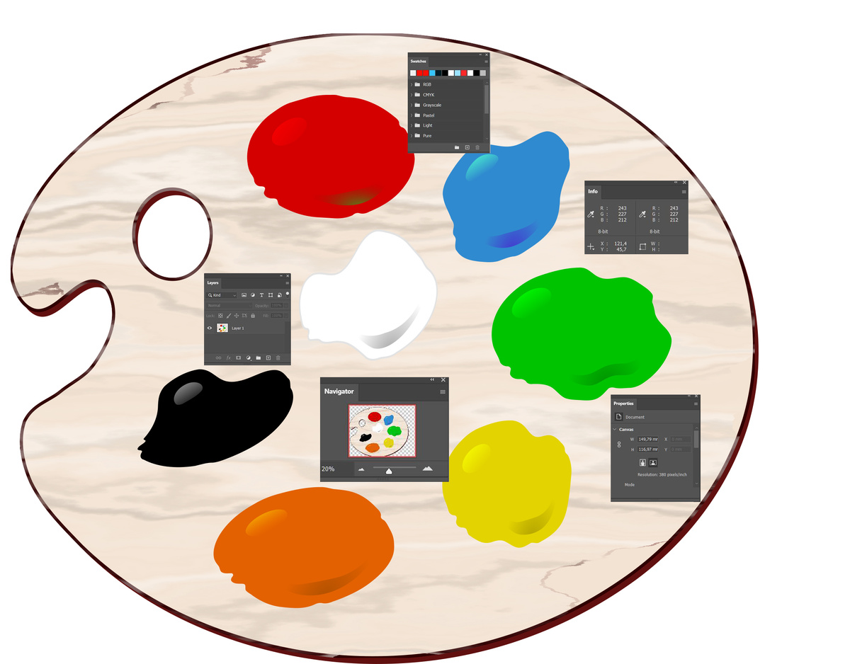 Если кратко, то палитры — это небольшие диалоговые окошки, которые предназначены для работы с изображениями. Не все палитры вам понадобятся в работе с изображениями, поэтому вы можете создать для себя необходимый минимум и расположить палитры, так, как вам удобно, чтобы не загромождать пространство. Палитры, которые открыты на экране, в меню Window отмечены галочками. Например, у меня в данный момент открыты такие палитры: