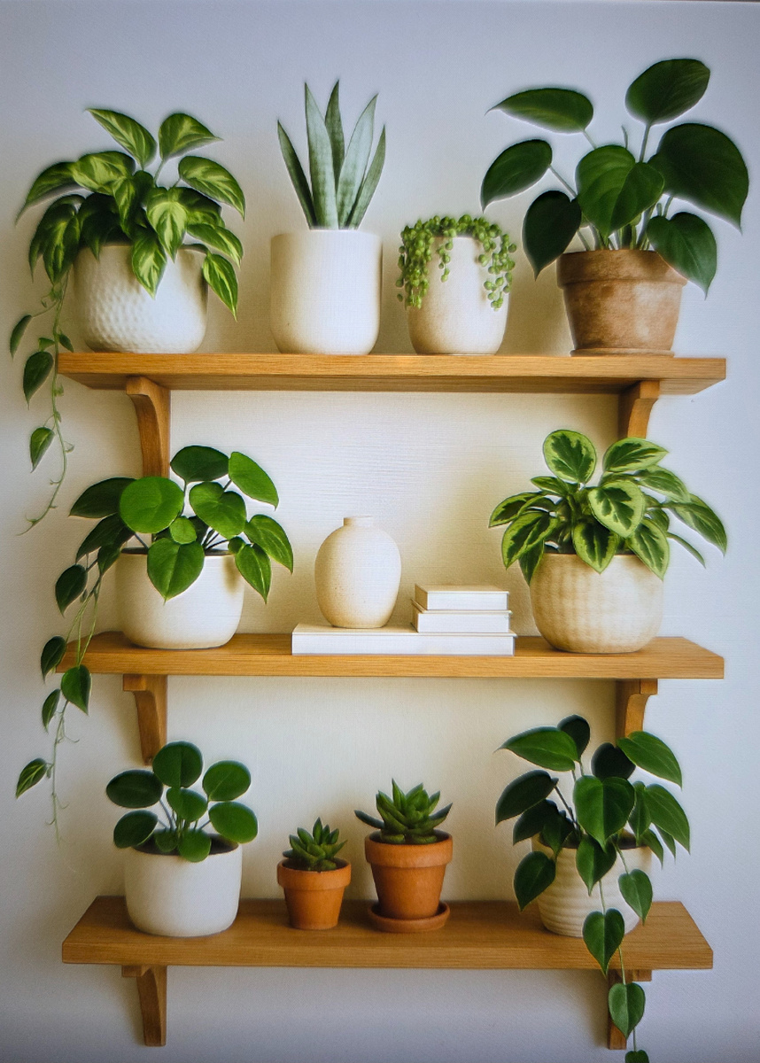 Комнатные растения давно перестали быть просто зеленью на подоконнике. Сегодня они - полноценные участники интерьера. А правильно оформленные полки для растений превращаются в мини-оазисы для уюта, свежести и вдохновения. Итак, как красиво расставить растений на полках и что важно учесть, что бы зеленый уголок был не только стильным, но и удобным в уходе. Один из главных приемов - многоуровневость. Ставьте рядом высокие и низкие растения, чередуйте ампельные (например, эпипремнум, традесканцию, хойю) с компактными (пеперомии, суккуленты). Это создает динамику и объем, особенно если полка широкая или занимает угол комнаты. Чтобы не перегрузить взгляд оставляйте "воздух" - пусть между горшками будет пространство. А кашпо лучше выбирать в разной палитре, но разных форм: так полка будет выглядеть стильно, но не скучно. Растениям нужен свет, и тут важен баланс между эстетикой и логикой. Лучше всего размещать полки: Не бойтесь размещать свои полки над столом, диваном или в ванной - если ест