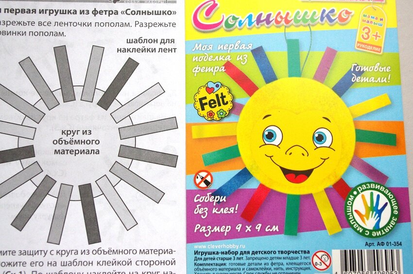 Набор называется: «Солнышко: моя первая поделка из фетра». Производитель: «Клевер». В составе набора: пять тонких цветных ленточек из плотной бумаги; жёлтый круг из фетра; (объёмный) круг из вспененного пластика с липким слоем с одной стороны; наклейка с изображением лица;
