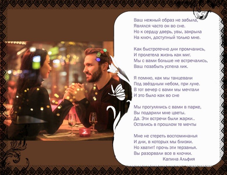 Ваш нежный образ не забыла, Являлся часто он во сне. Но к сердцу дверь, увы, закрыла На ключ, доступный только мне. Как быстротечно дни промчались, И пролетела жизнь как миг. Мы с вами больше не встречались, Ваш позабыть успела лик. Я помню, как мы танцевали Под звёздным небом, при луне. В тот вечер с вами мы мечтали И это было как во сне Мы прогулялись с вами в парке, Вы подарили мне цветы. Да. Эти встречи были жарки.. Остались в прошлом те мечты Мне не стереть воспоминанья И дни, в которых мы близки. Но хватит! прочь эти терзанья. Вы разорвали все в клочки. Меня вы сами отдалили, Сказав, что больше не важна. Все чувства вы во мне убили, Ведь я была вам не ценна. В тот день и я закрыла сердце, И позабыла вас я в миг, И на замок закрыла дверце, И положила ключ в тайник. Теперь о вас не вспоминаю. Живите, как и жили вы. Ваш облик в памяти стираю, И вы мне больше не нужны. И все признанья ваши, чувства, Прикосновенья, дрожь, любовь, Все вечера и дни безумства, - Забыто всё. Осты