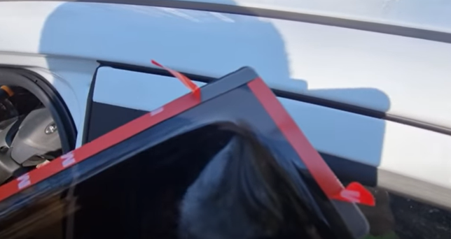 Небольшой лайфхак: немного пленку снимите со скотча, чтобы приложить, выровнять. А потом будете сдергивать пленку полностью, чтобы дефлектор приклеился к двери.