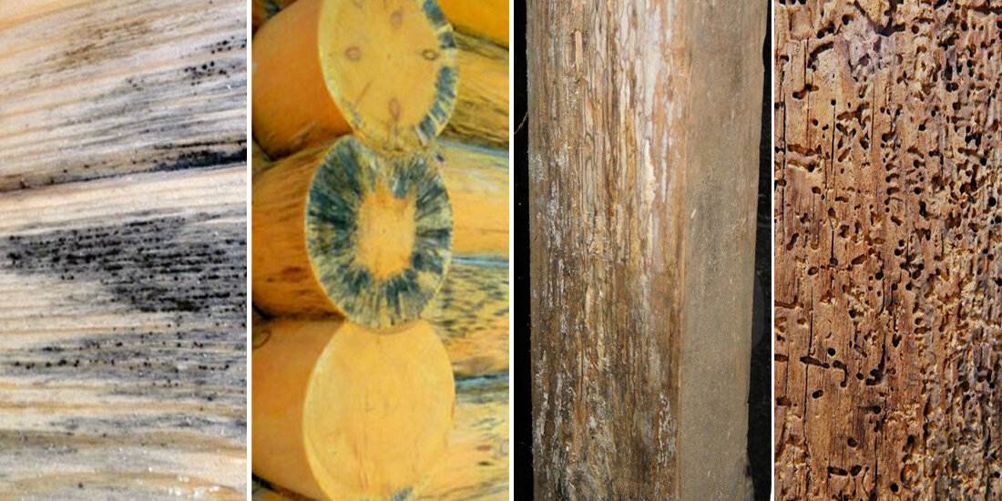 Тревожным признаком порчи древесины является посинение. Оно происходит чаще всего при повышенной влажности воздуха и температуре 10-25°. Также способствует посинению застой воздуха. Влажная свежеспиленная древесина наиболее подвержена посинению. Однако и вполне сухая древесина может быстро посинеть. Сильно подвержен синеве сосновый пиломатериал в летние месяцы. Синева на поверхности пиломатериала может наблюдаться даже в супер проветриваемых штабелях. Вопреки слухам, синева ни как не изменяет механических свойств древесины. Поэтому с синевой можно успешно бороться. Распространенное средство против поверхностной синевы - «Белизна». После ее применения поверхность дерева становится белесой.