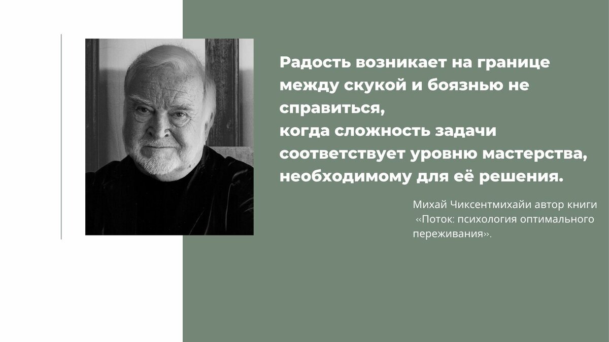 - Концентрация — чем глубже ты погружён в деятельность и чем меньше ты отвлекаешься, тем больше шанс попасть в поток.
