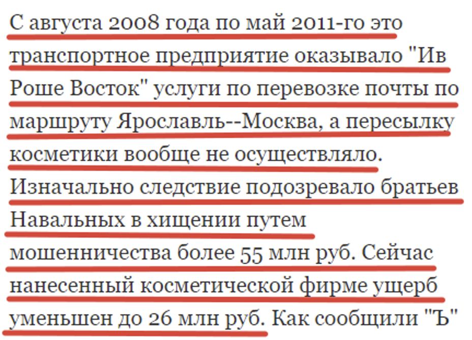 Дело «Ив Роше» в отношении братьев Навальных является экономическим преступлением : ООО «Главное подписное агентство», создателем которого являлся Алексей Навальный, обманным путем заключило договор по оказанию услуг по пересылке косметических товаров для ООО «Ив Роше Восток». Фактически предприятие не оказывало услуг по перевозке косметики: изначально следствие подозревало братьев Навальных в хищениях 55 млн рублей, позже ущерб был оценен в 26 млн рублей.