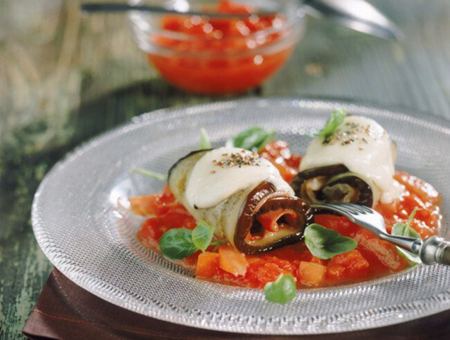 1. Разогрейте сковороду-гриль. Помидор нарежьте на 4 кольца, моцареллу — на 4 части. Баклажан нарежьте по диагонали. В центр каждого овала баклажана положите кольцо помидора, сверху — кусок моцареллы. Порвите руками листья базилика, посыпьте им моцареллу, а также положите сушеные томаты.