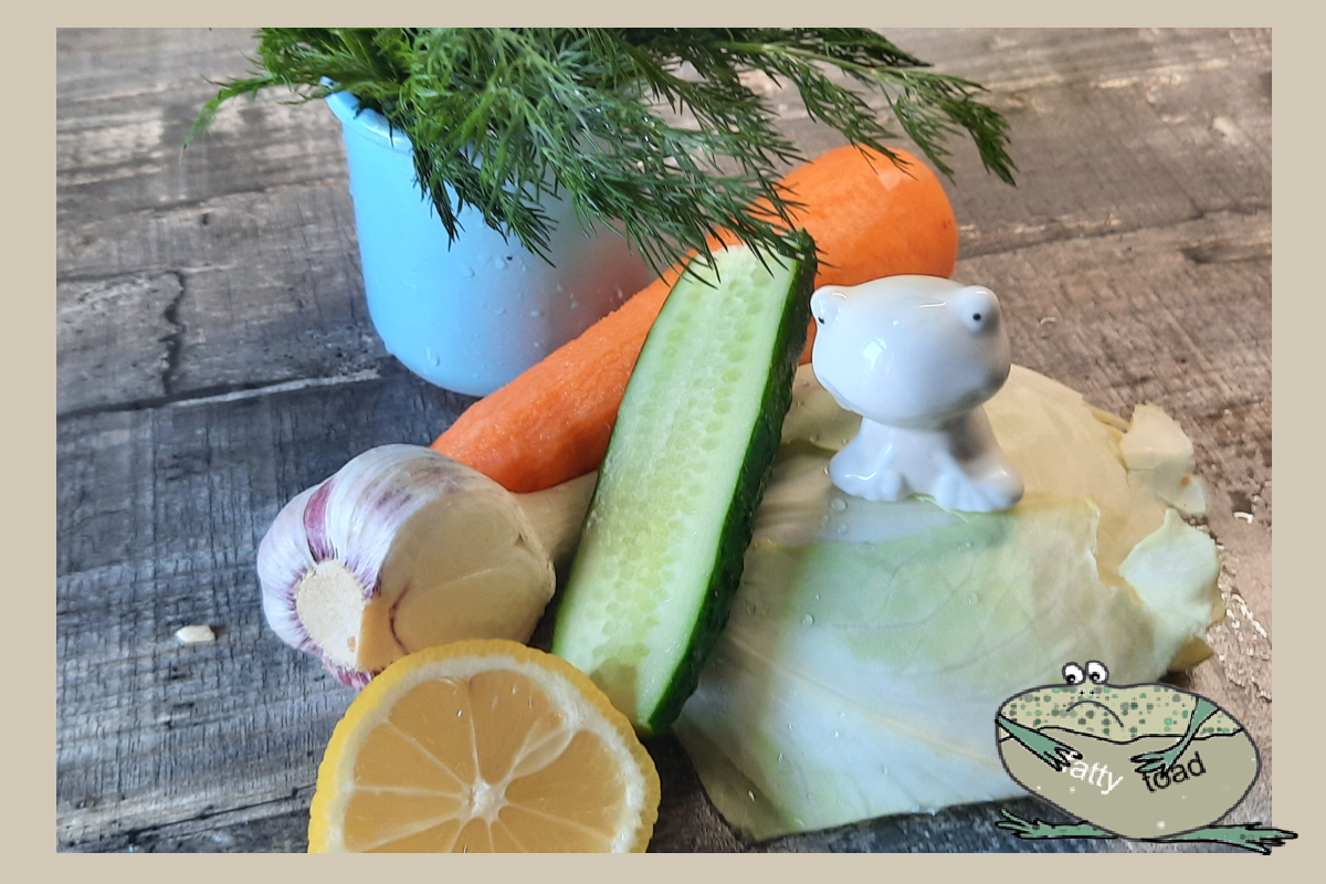Сначала перетираю руками нарезанную капусту с солью, сахаром и перцем. Потом добавляю тертую морковь, крупно, но тонко порезанные огурцы и чеснок. А также укроп. Поливаю лимонным соком. В этот момент, кошка, делая вид, что ее травят, пулей покидает кухню, жмурясь и отплевываясь.