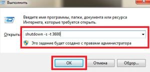 Первый вариант заключается в том, чтобы нажать две клавиши одновременно: [Пуск]+[R]. В появившемся окне наберите следующее: shutdown -s -t и укажите время, через которое следует отключить ПК. Например, нам требуется завершить работу через 1 час. В таком случае команда имеет следующий вид: shutdown -s -t 3600.