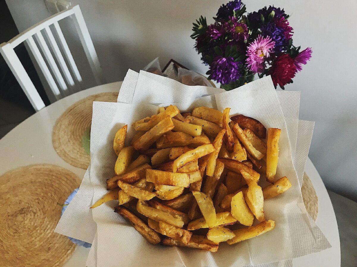 1. Картофель помыть, очистить от кожуры и снова помыть. Способ нарезания может быть любой: на средние дольки или на палочки, как при приготовлении картофеля фри. Главное правило – это не должны быть толстые бруски, которые затем останутся сырыми внутри. Нарезанный картофель выложите в большую миску и тщательно (несколько раз) промойте под холодной водой. Это необходимо для того, чтобы на картошке не осталось лишнего крахмала. Лишняя влага нам тоже не нужна, слейте воду тщательно;