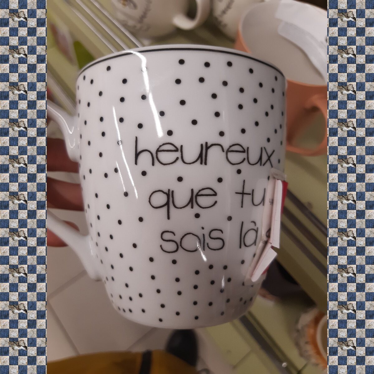 Кружка с надписью на латыни, которая переводится как "Счастлив, что ты есть" - кажется так. Знающие люди, поправьте меня, если переводится не так. Мы все (я и читатели) будем вам благодарны. Почему эта кружка на последнем месте, она же такая симпатичная - спросите вы. А я отвечу: все кружки в этой подборке красивые, но нужно ведь какую-то поставить в конец, так пусть это будет белая кружка в черный горошек с надписью. Мне просто кажется, что этот горошек очень упрощает вид, а надпись наоборот, поэтому эти два украшения у меня не очень-то сочетаются противореча друг другу. Объем не указан. Стоимость 159 рублей.