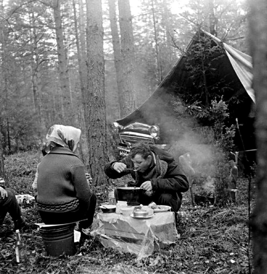 Так отдыхал человек, прославивший нашу Родину. Лес, палатка, костер, еда из котелка.