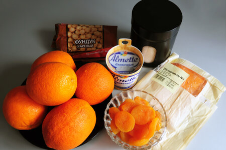 1. На фото набор продуктов для сырной закуски: морковный сыр Bio-Rueblikaese, творожный сыр Almette, курага, апельсины, жареный фундук, сахар. Курагу замочите на 2 часа в тёплой воде. Для карамелизованного фундука сварите светло-золотисую карамель: 3 части сахара и 1 часть воды уварите в сотейнике до светло-золотистого цвета. Снимите сотейник с огня и слегка остудите содержимое (опускаю сотейник в ледяную воду на несколько секунд). Как только карамель станет тягучей, окуните ядра фундука, нанизанные на деревянные шпажки, в карамель. Зафиксируйте шпажки горизонтально рабочей поверхности, воткнув их, например, в стопку из книг. Оставьте при комнатной температуре до полного застывания карамели (внимание! карамель в холодильнике "плачет" и течёт... орехи снимаем со шпажек непосредственно перед сервировкой) .