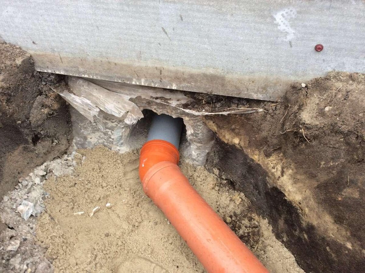Оказавшись в такой ситуации, подготовьте все необходимое для земляных работ: канализационный слив придется выводить наружу под фундаментом. Работа трудоемкая, долгая, но выполнить ее можно без помощи специнструмента и без нужды калечить заливку ручным отбойником.