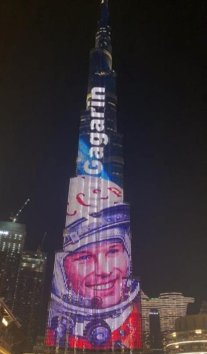 На самой высокой башне мира Бурдж-Халифа появился портрет Юрия Гагарина в честь 60-летия его полета в космос.